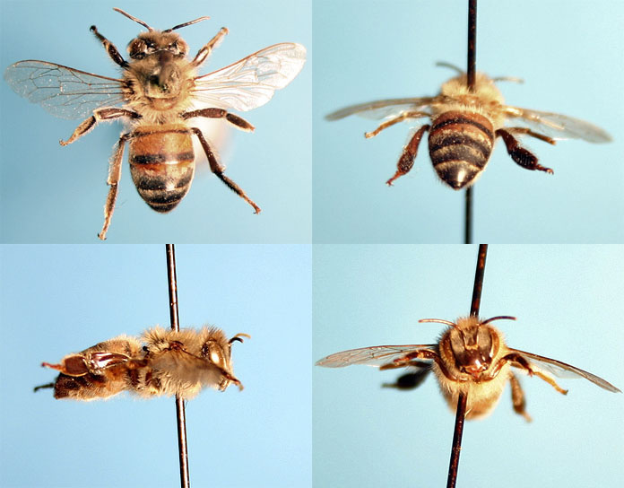 The honey bee is about one half inch long and rather stocky in body form. The head and thorax are dark brown, and they are densely covered with pale yellowish hair. The abdomen is hairy on the underside but is noticeably less hairy than the head and thorax on the upperside, which is brown with black banding (without any yellow in the cuticle), the hind part being almost entirely black with narrow transverse bands of pale hair at the intersections of the abdominal segments.