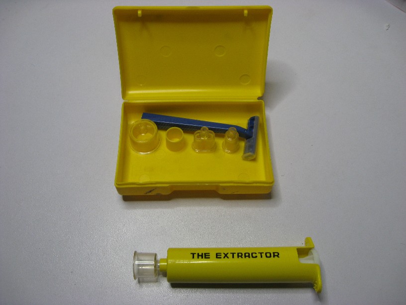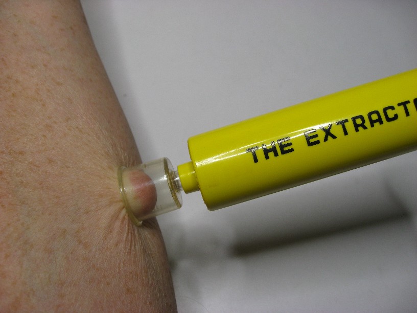 Bee spotter John Dahlstedt brought to our attention a commercially available product called The Extractor, which uses a suction device to extract venom from bee stings. The product works like a charm according to John, who wrote, "I have personally used it on yellow jacket stings several times and always the pain was completely gone after 3-5 minutes of use. I have volunteered the use of this to many others that have been stung and it had the same positive effect on them. If there is a stinger present, it of course should be removed first." We do not wish to condone one product over others, merely to convey useful information based on personal experiences. If you have had good experiences with other bee sting treatments, please let us know!